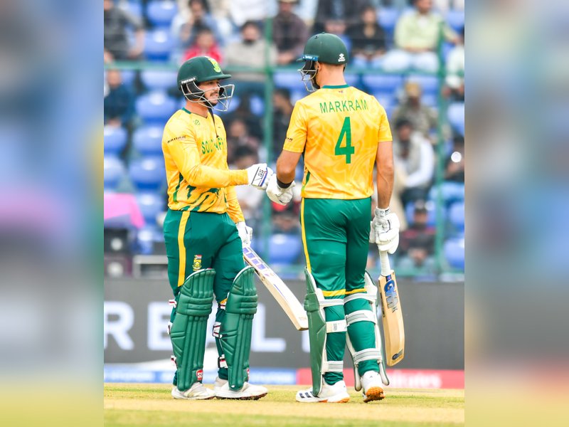 123 रन के लक्ष्य का पीछा करने उतरी दक्षिण अफ्रीका को कप्तान एडन मार्करम और क्विंटन डिकॉक ने तेज शुरुआत दी और 3 ओवर में 32 रन जोड़े। मार्करम 11 गेंदों पर 5 चौके और 1 छक्के की मदद से 28 रन बनाकर आउट हुए। 56 के स्कोर पर दूसरे विकेट के रूप में डिकॉक आउट हुए। डिकॉक थोड़े धीमे रहे और 16 गेंदों पर 14 रन बनाकर आउट हुए।